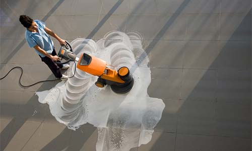 Hier werden Einrichtungsgegenstände, Betriebsmittel oder auch Bodenbeläge von Grund auf gereinigt. Dabei werden alte Pflege- und Transportschichten bis auf die Belagsoberfläche entfernt.